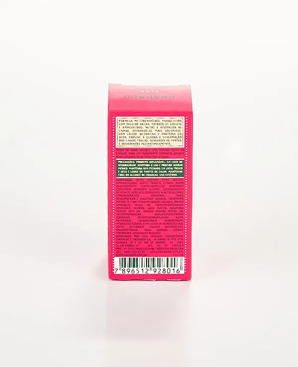 Branco transparente. Indicada para o tratamento completo de unhas fracas e quebradiças. Promove força, endurecimento, crescimento, nivelamento, hidratação, nutrição e brilho. Enriquecida com queratina, cálcio, proteína da seda, aminoácidos, vitamina E, óleos de Argan e Baobá e extrato de Violeta. Livre de tolueno, formaldeído e DBP.