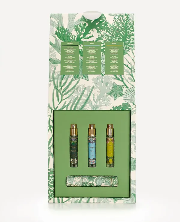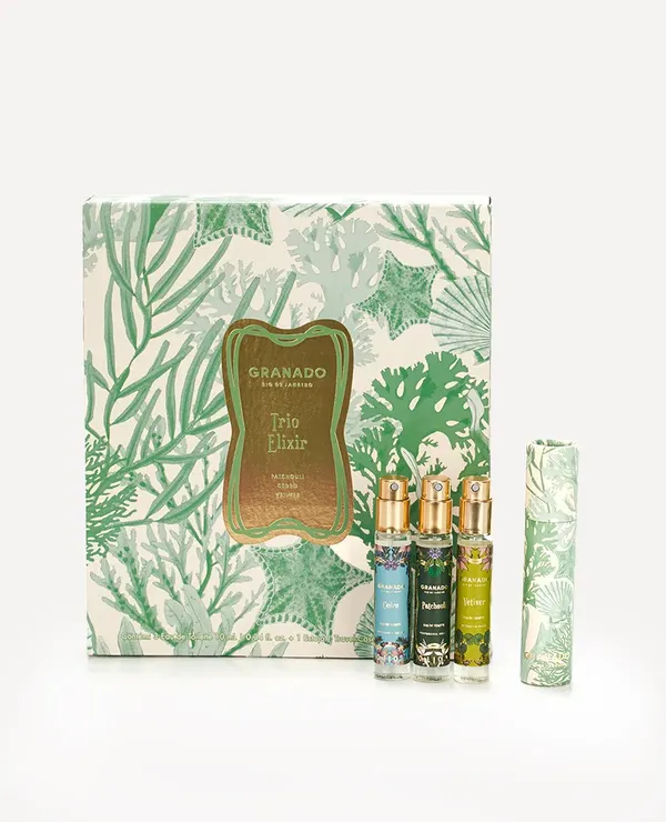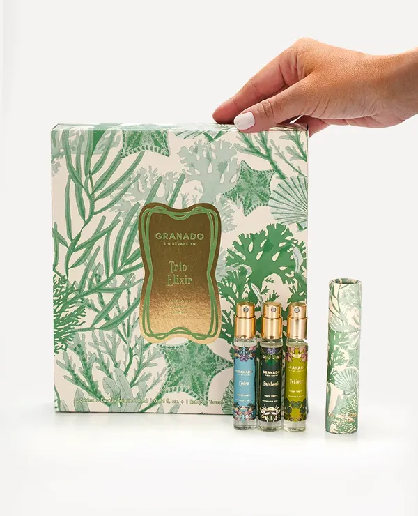 O kit Coleção Perfumes Elixir traz as fragrâncias Patchouli, Cedro e Vetiver em tamanho exclusivo de 10ml! Além de acompanhar um charmoso estojo estampado com a temática da coleção para ser usado como porta-fragrância. Perfeito para carregar no nécessaire e na bolsa.