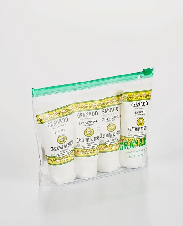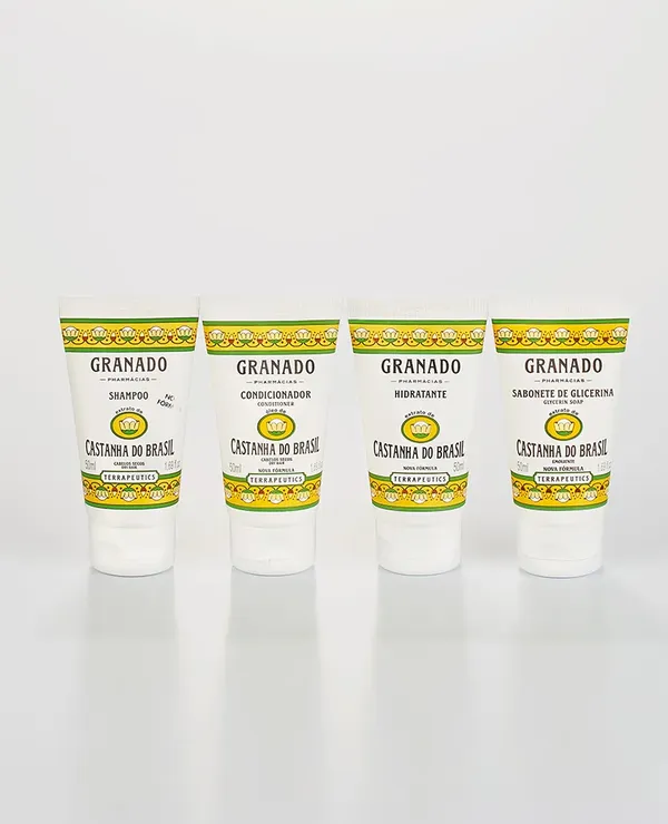 Embalagens em tamanho ideal para levar no nécessaire. Produtos enriquecidos com extrato e óleo de castanha do Brasil, que tem ação hidratante. Shampoo e condicionador que limpam, condicionam e hidratam os fios; sabonete líquido formulado com glicerina vegetal, e hidratante corporal de rápida absorção que amacia, perfuma e suaviza a pele.