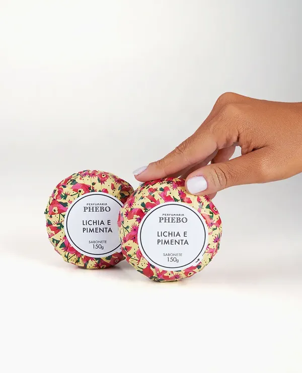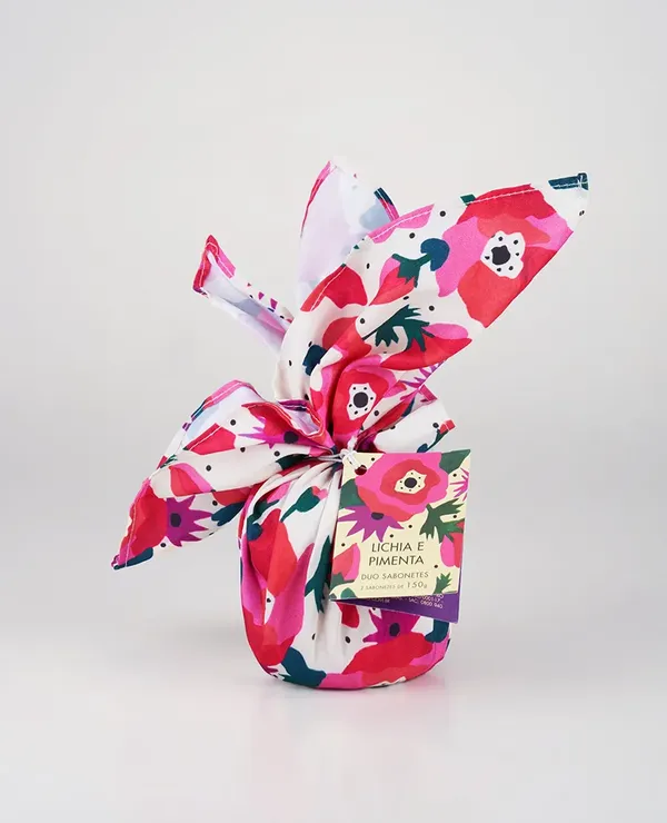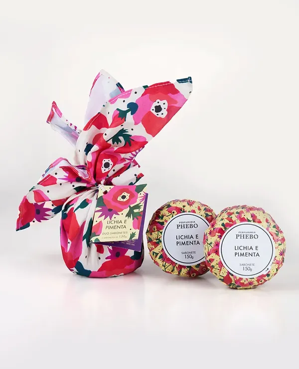 Eles vêm acompanhados de um lenço exclusivo estampado, inspirado na fragrância Lichia e Pimenta, unindo cuidado e estilo em um presente especial.
