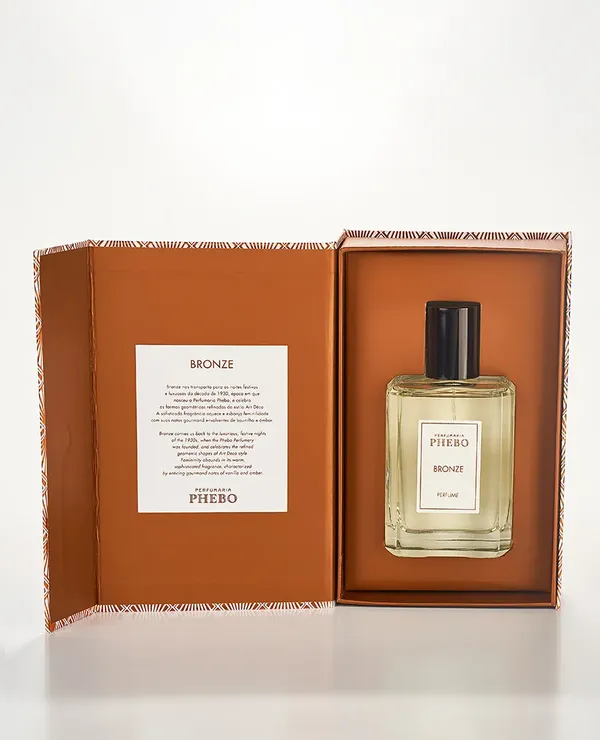 Bronze nos transporta para as noites festivas e luxuosas da década de 1930, época em que nasceu a Perfumaria Phebo, e celebra as formas geométricas refinadas do estilo art déco. A sofisticada fragrância aquece e esbanja feminilidade com suas notas gourmand envolventes de baunilha e âmbar. O perfume é rico em óleos naturais, produzido com álcool extra neutro e macerado. O resultado é uma fragrância com notas mais encorpadas, intensas e olfativamente fiéis às suas matérias-primas.