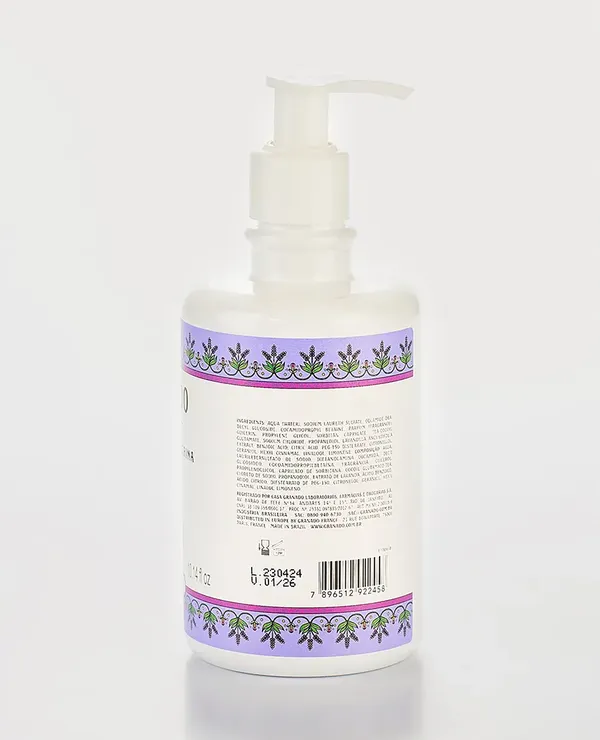 Formulado com pH da pele, glicerina vegetal e alta concentracao de extrato natural de lavanda, que tem acao relaxante. Limpa suavemente a pele, deixando-a macia e perfumada. Formula biodegradável. Livre de parabenos e ingredientes de origem animal.